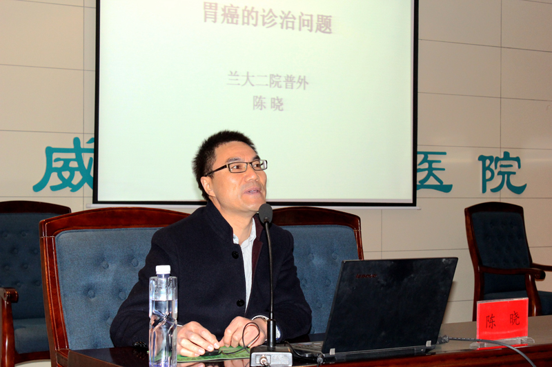 醫(yī)院邀請到蘭州大學(xué)第二醫(yī)院普外三科主任、胃腸外科主任、主任醫(yī)師陳曉和普外二科副主任,副主任醫(yī)師康博雄為大家作學(xué)術(shù)講座。陳曉主講了《胃癌的診治問題》,并與大家分享了他在法國醫(yī)院和美國醫(yī)院進(jìn)修學(xué)習(xí)時的一些感想和見聞。陳曉在講座中結(jié)合臨床體會說:許多胃癌患者在就診時已經(jīng)發(fā)展為中晚期,失去了手術(shù)機會。他呼吁全社會要認(rèn)識到對胃癌高發(fā)地區(qū)、高危年齡、高危人群進(jìn)行篩查的必要性。醫(yī)生要對有癥狀的患者及早進(jìn)行胃鏡檢查,爭取做到早發(fā)現(xiàn)、早診斷、早治療。講座中,陳曉就外科手術(shù)吻合方式選擇與直屬附屬醫(yī)院外科主任滕志勇醫(yī)生進(jìn)行了現(xiàn)場互動。
