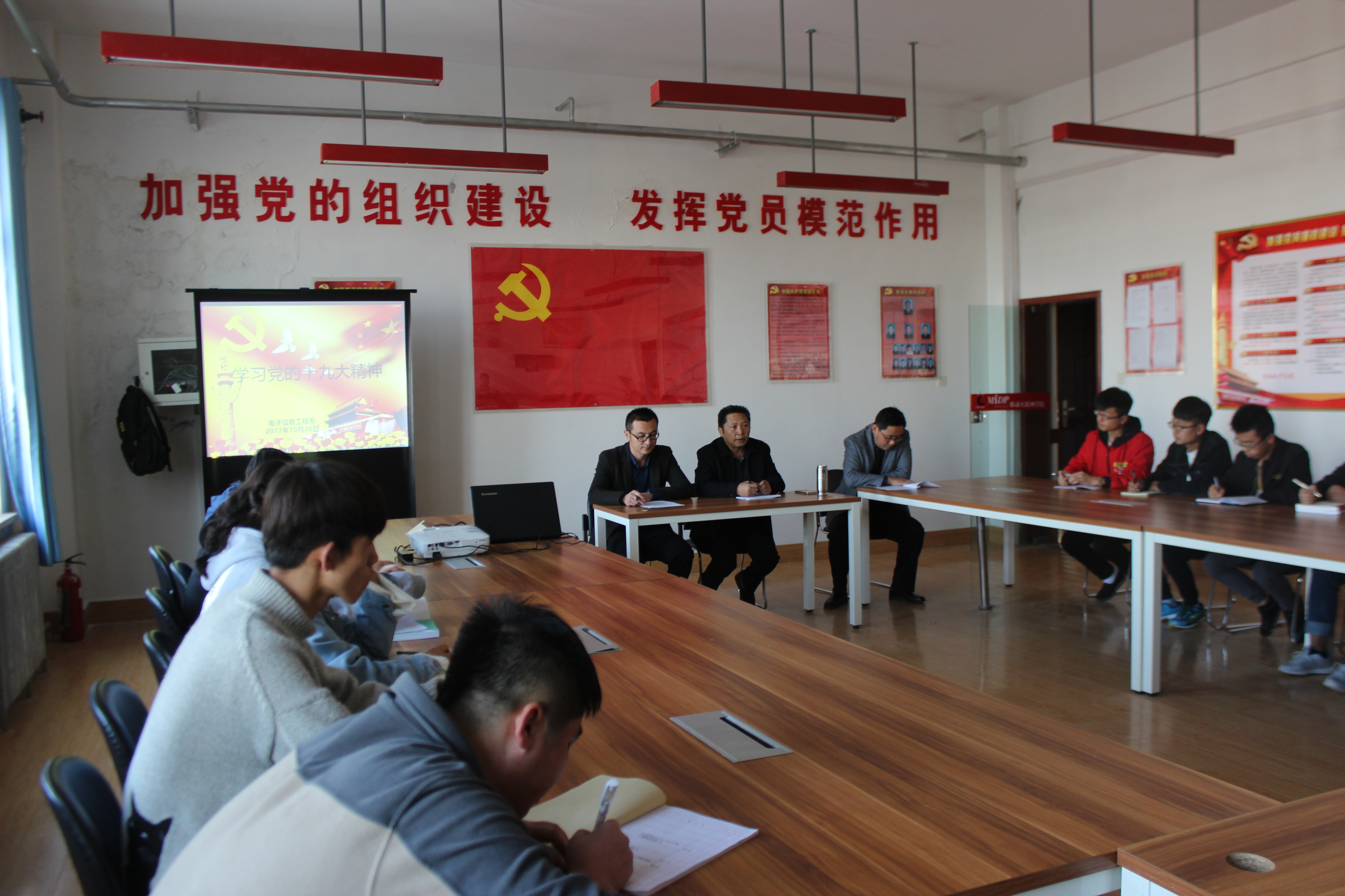 10月26日,電子信息工程系組織全體教師、學(xué)生干部在尚德樓黨員活動室集中學(xué)習(xí)黨的十九大報告和十九大會議精神。系黨總支書記袁青年主持學(xué)習(xí)會議。
