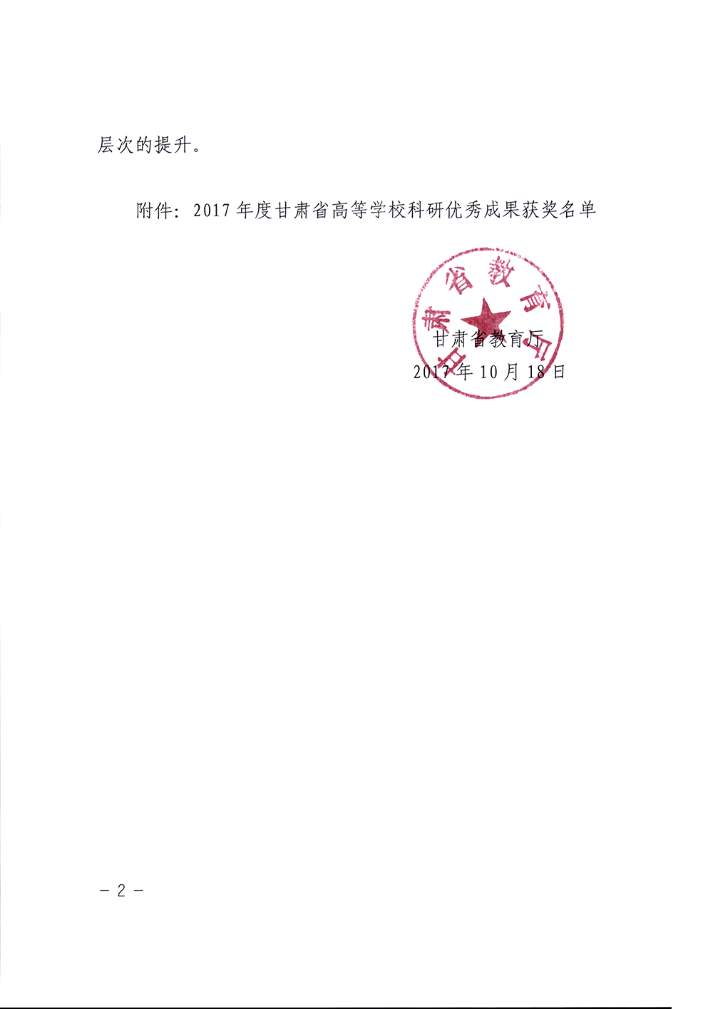 2017年度甘肅省高等學??蒲袃?yōu)秀成果獎勵證書