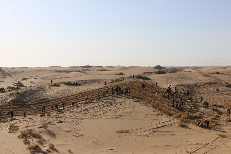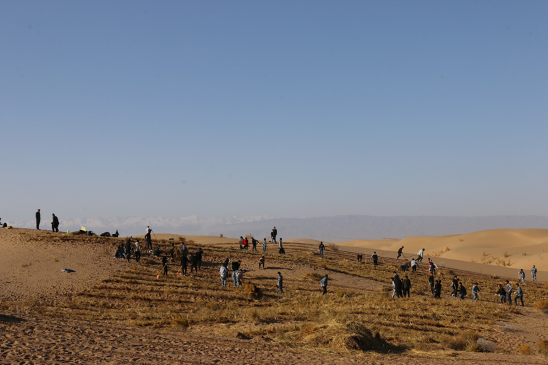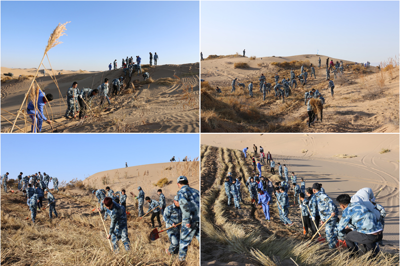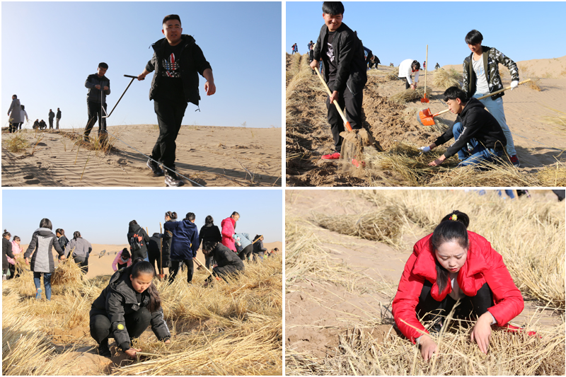 在勞動現(xiàn)場,學院領(lǐng)導和師生們不畏冬寒,分工協(xié)作,按照標準和要求劃線開溝、蒲草培沙、等距離推進,現(xiàn)場一片熱火朝天的景象?;氖彽纳车厣砼乱?,整齊的稻草方格逐漸向遠處的沙丘覆蓋。