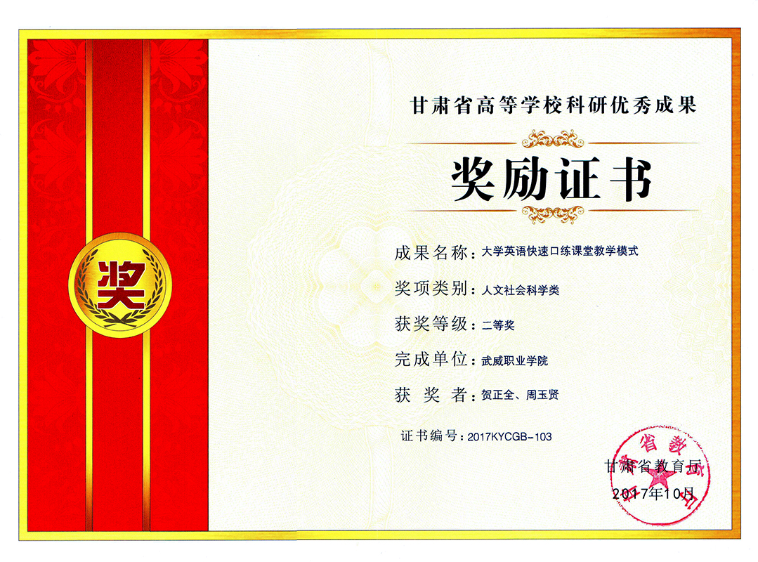 近日從學(xué)院科研處傳來(lái)喜訊,我系教師賀正全申報(bào)的《大學(xué)英語(yǔ)快速口練課堂教學(xué)模式》榮獲甘肅省教育廳頒發(fā)的2017年甘肅省高等學(xué)校科研優(yōu)秀成果二等獎(jiǎng)。這是我院自建院以來(lái)獲得的最高級(jí)別的高??蒲袃?yōu)秀成果獎(jiǎng)。本次獲得二等獎(jiǎng)的科研成果共有154項(xiàng),其中高職高專(zhuān)報(bào)送的科研成果只有9項(xiàng)獲得二等獎(jiǎng)。